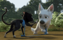 На пути Вольта встречаются два новых друга: страус по имени Зевс и кошка Миттенс. Зевс — забавный и отважный персонаж, который обладает отменным оптимизмом и готов помочь Вольту разобраться с реальной жизнью. Миттенс — умная, но циничная уличная кошка, которая поначалу относится к Вольту с недоверием, но позже становится верным товарищем в его приключениях. Вместе эта необычная команда пытается вернуться на студию и спасти сериал, при этом каждый из героев проходит через саморазвитие и осознаёт роль настоящей дружбы и преданности.